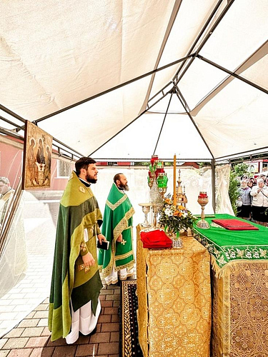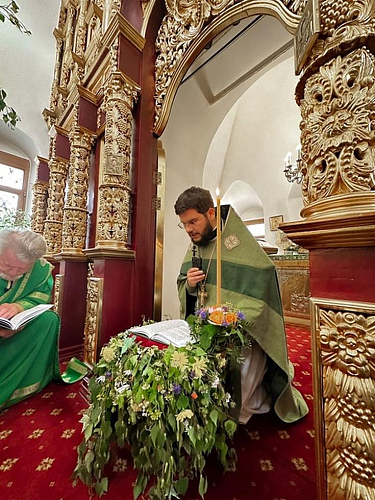 После Литургии был совершен праздничный Крестный ход вокруг храма с чтением Евангелия и окроплением святой водой, затем в благоговейной обстановке была совершена Великая вечерня с чтением коленопреклоненных молитв.