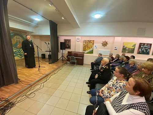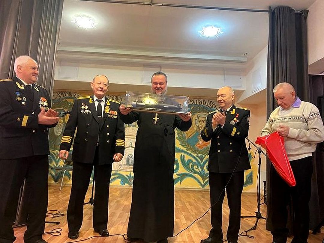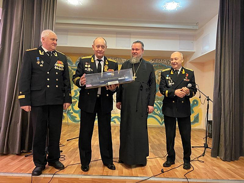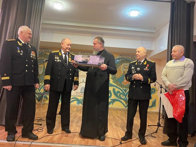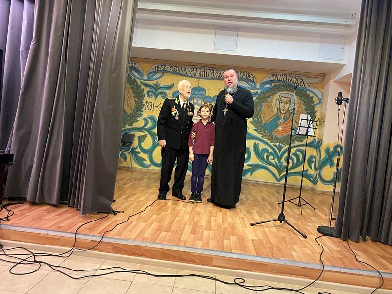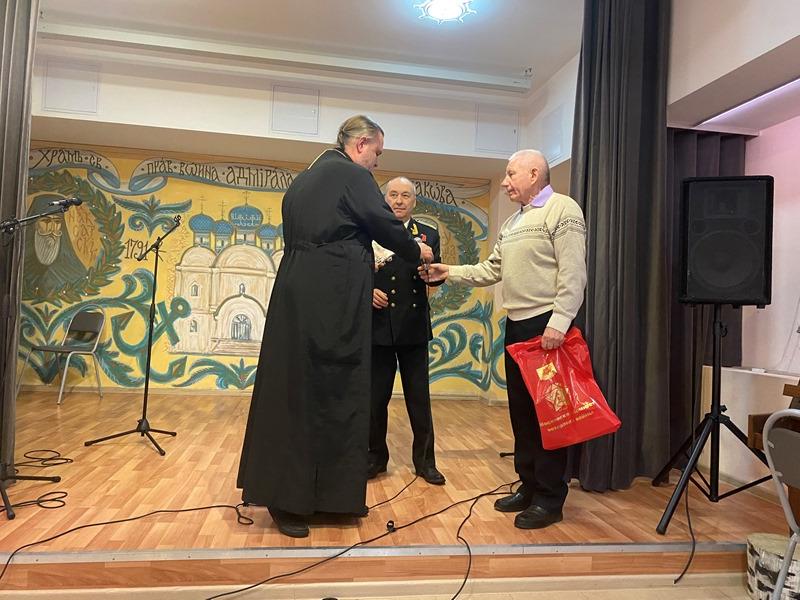 Председатель Совета ветеранов Черноморского флота капитана 1 ранга Анатолий Леонтьевич Егоров поздравил настоятеля и передал в Воскресную школу храма сборник патриотических афиш по Дням воинской славы.