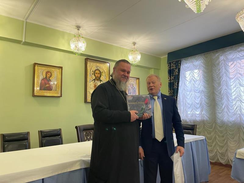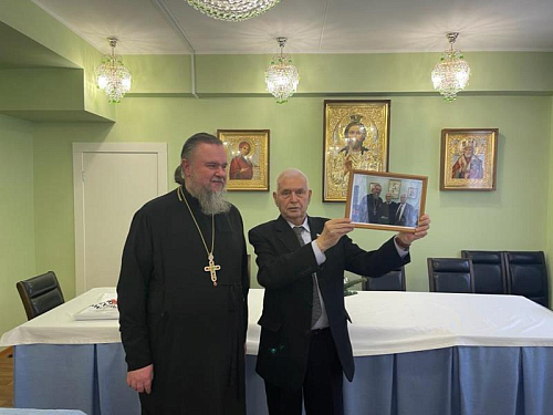 Заместитель директора школы 1161 и Председатель Краеведческого общества Антон Семенович Никулин передал настоятелю замечательные книги по истории Российского флота и краеведению Москвы. Настоятель тепло поздравил Антона Сергеевича с прошедшим недавно 40-летием со дня рождения и вручил ему Поздравительный адрес.
