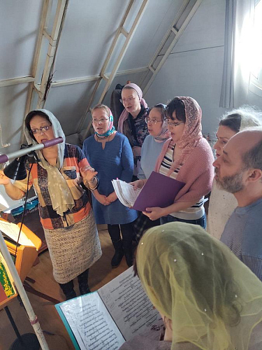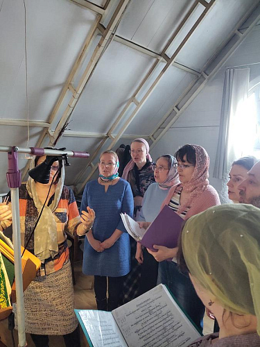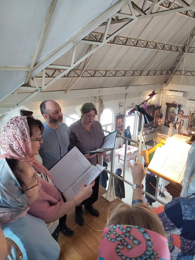 Народный хор храма осваивает обиходные, знаменные и партесные церковные песнопения Литургии.