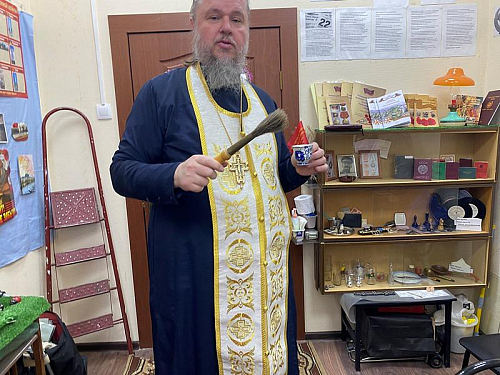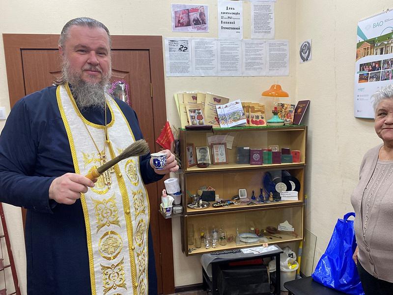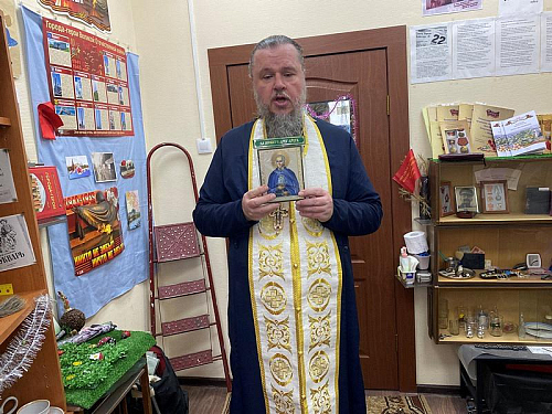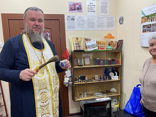 Игумен Дамиан по просьбе ветеранов совершил чин освящения рабочего помещения РОО "Дети ВОВ" и подарил сотрудникам икону святого праведного воина Феодора Ушакова.