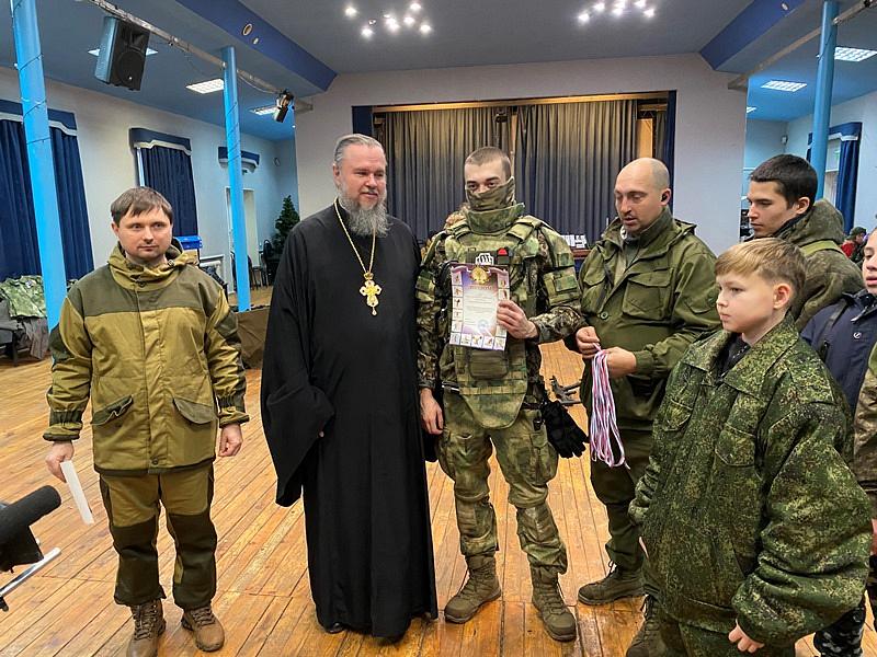 Организаторами спортивно-патриотического мероприятия был приглашен настоятель храма святого праведного воина Феодора Ушакова в Южном Бутове игумен Дамиан (Залетов), член штаба Юнармии ЮЗАО г. Москвы.