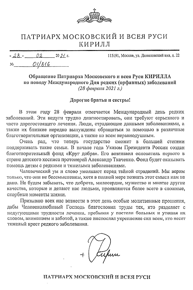 Обращение Святейшего Патриарха по случаю дня редких заболеваний