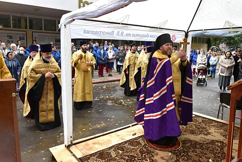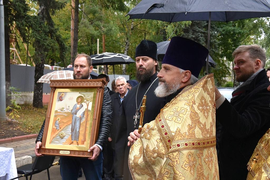 Его Преосвященству сослужили благочинный Андреевского округа, настоятель строящегося храма протоиерей Николай Карасев, клирик кафедрального соборного Храма Христа Спасителя диакон Иоанн Клинцов, духовенство Андреевского благочиния.