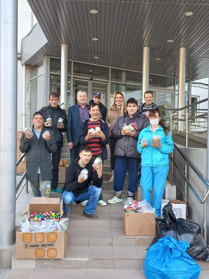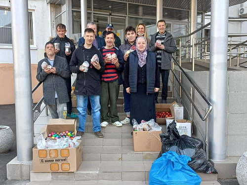 Для насельников социального дома были переданы освящённые куличи и яйца, а также продукты питания - хлеб, растительное масло, крупы, сахар, сладости, общим весом 200 кг.