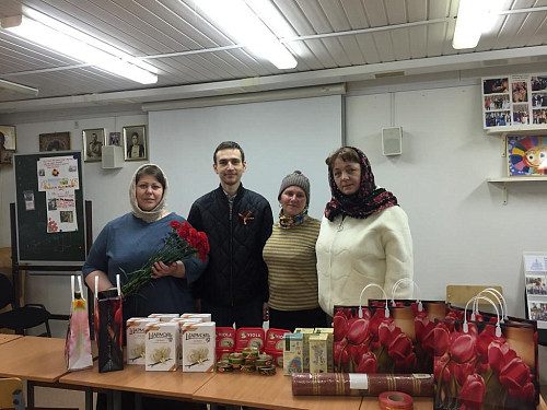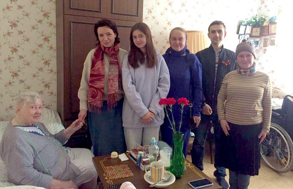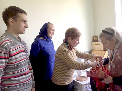 Добровольцы вначале поздравили ветеранов с Праздником Пасхи, передали артос, просфоры и пропели тропарь Пасхи, затем вручили подарки ко Дню Победы (цветы и продуктовые наборы).