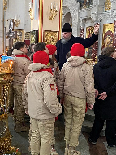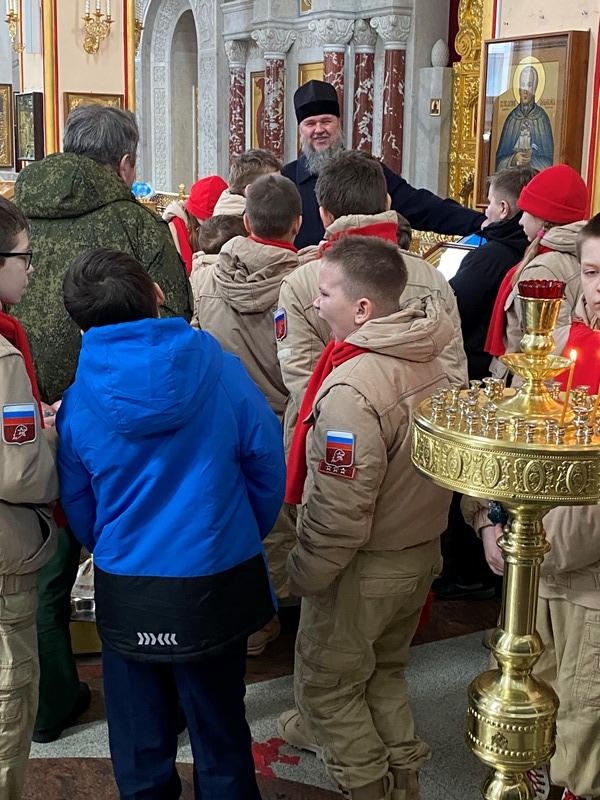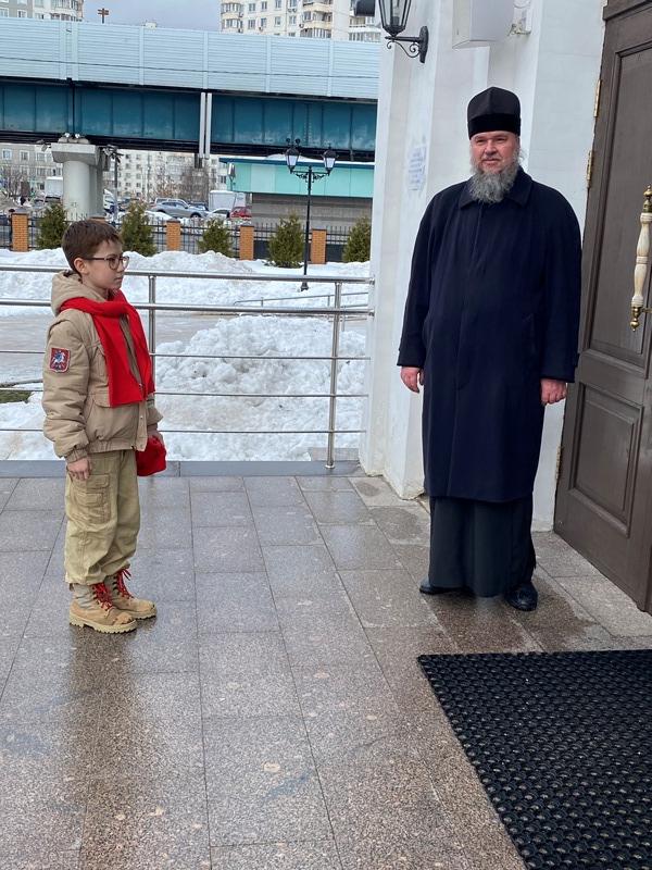 При входе в храм ребят встретил настоятель, член штаба Юнармии ЮЗАО г. Москвы, игумен Дамиан (Залетов), который рассказал о строительстве на этом месте храма в честь святого праведного воина Феодора Ушакова.