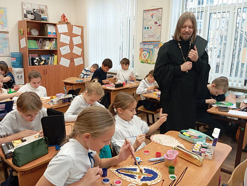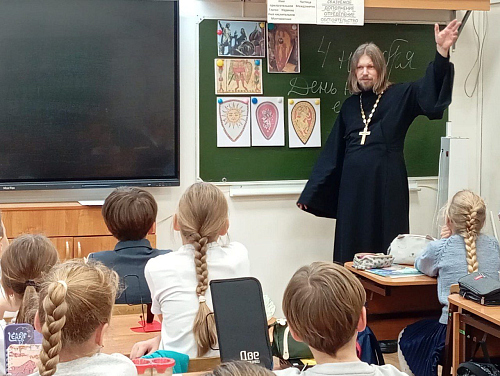 Во время урока священник Димитрий с ребятами поговорили об истории Смутного времени, рассмотрели главные черты характера князя Дмитрия Пожарского и Кузьмы Минина, погрузились в этимологию слова «защитник», и сами изготовили и украсили настоящий древнерусский щит в миниатюре.