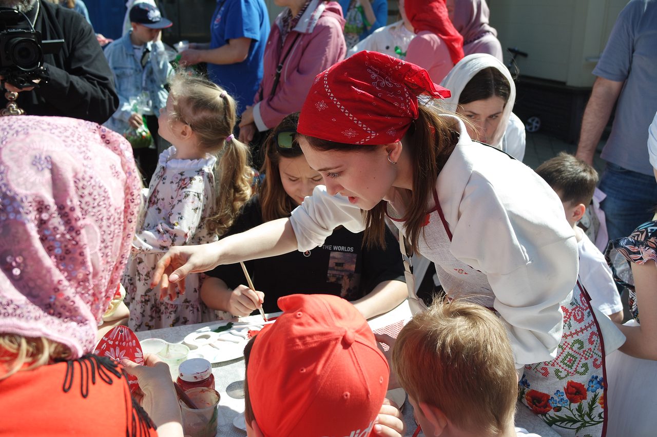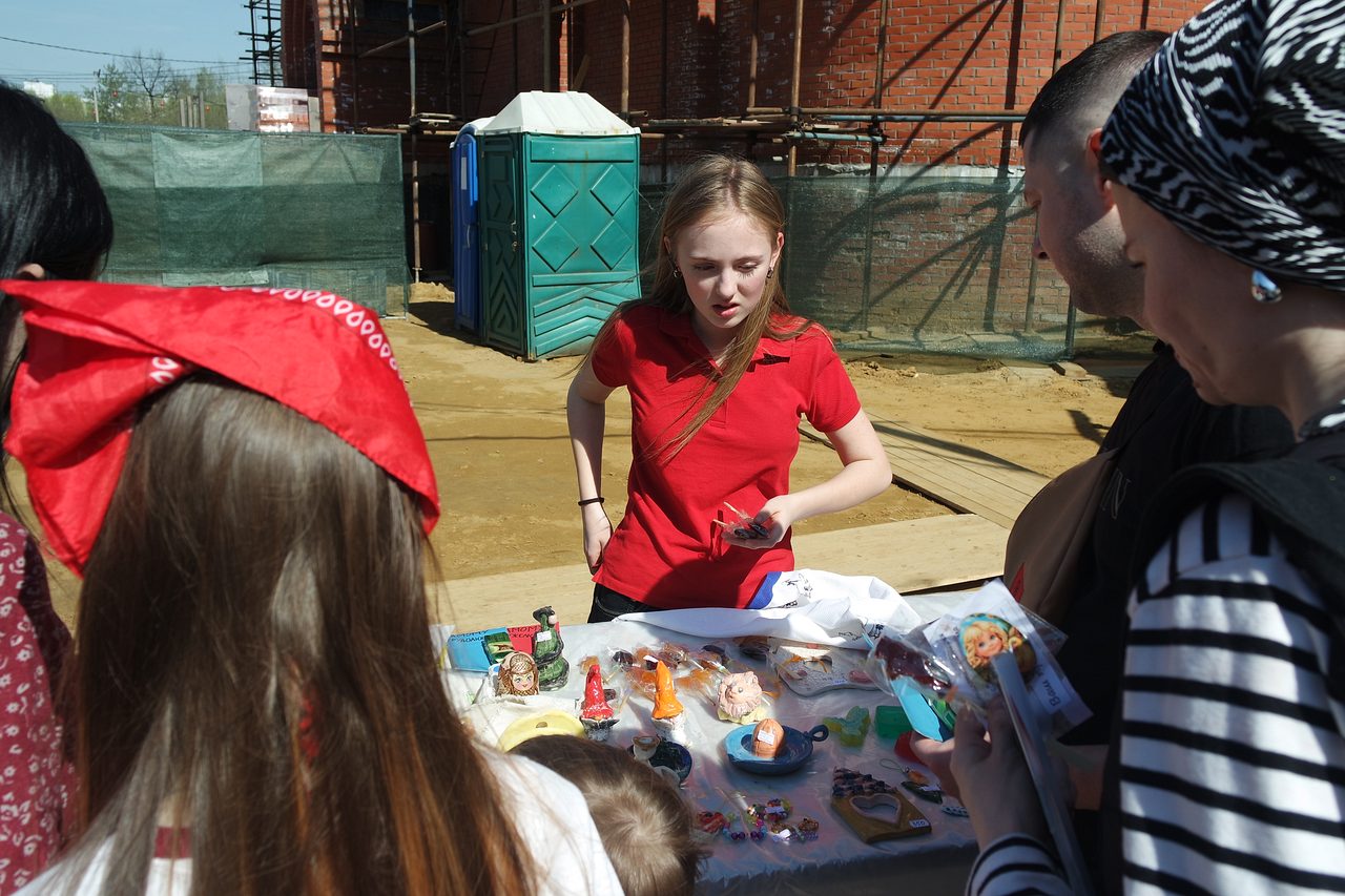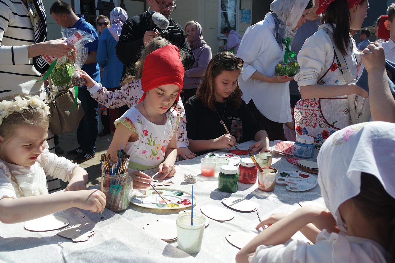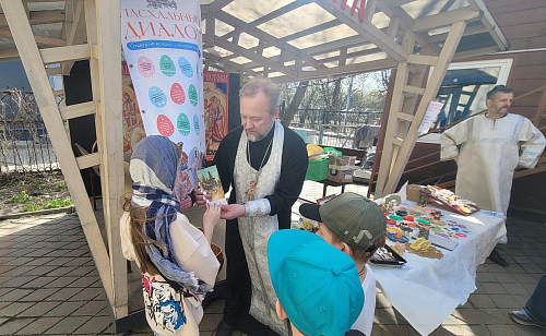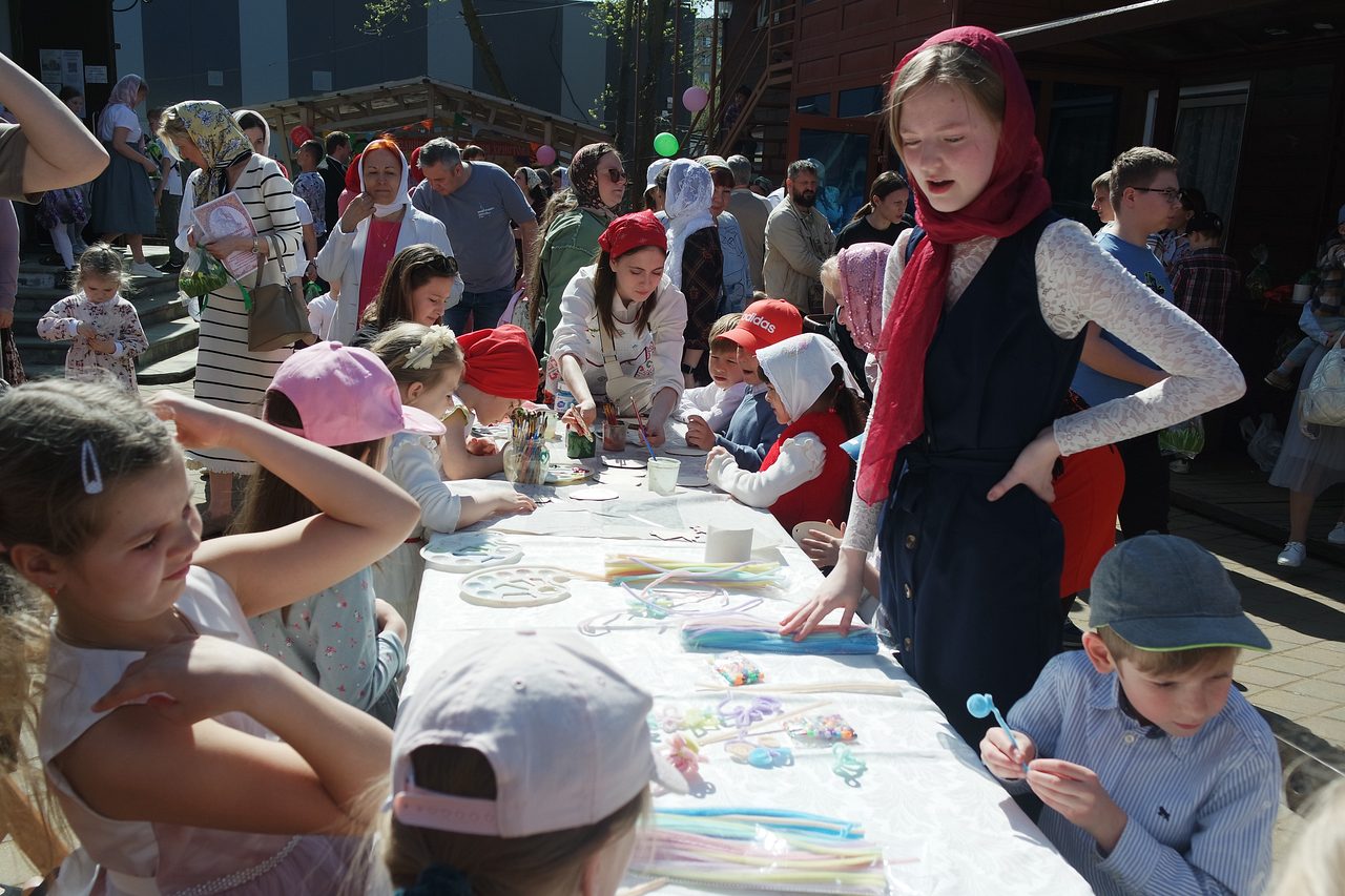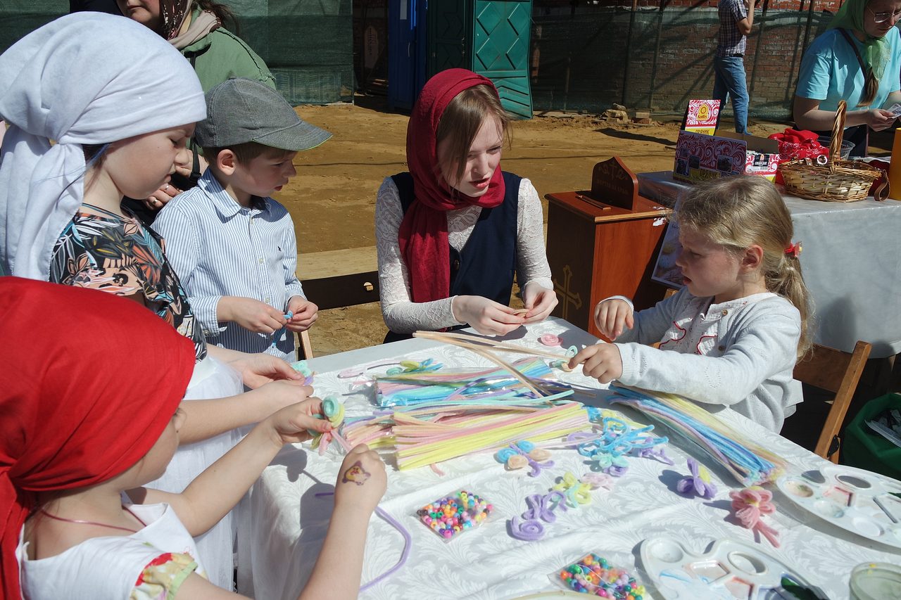 Затем на территории строящегося храма прошла Пасхальная ярмарка,а также мастер-класс для детей по изготовлению украшений, пасхальных сувениров и различных поделок.