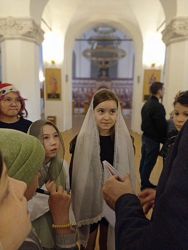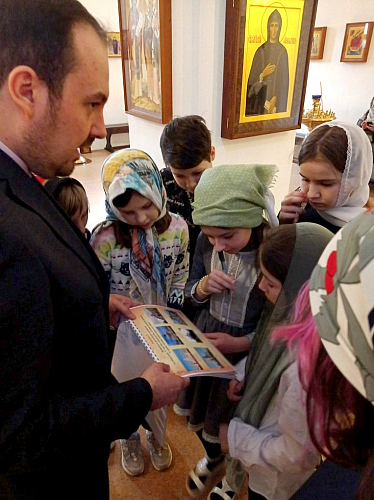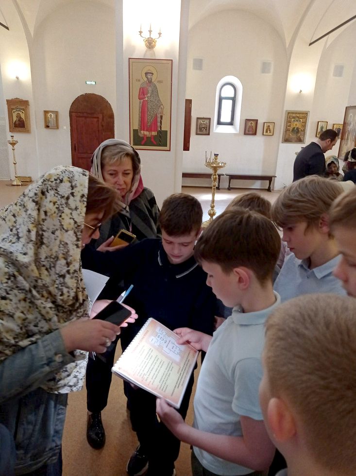 В конце экскурсии школьников ждал сюрприз: Денис Андреевич выдал им исследовательские книги. Ребятам предстояло решить 10 заданий, часть ответов на которые нужно было искать непосредственно внутри храма. Школьникам предстояло найти знакомых по урокам истории канонизированных князей и княгинь, научиться определять иконы Божией Матери и выполнить много других интересных заданий.
