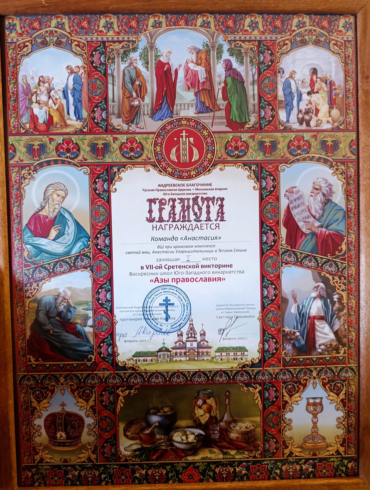16 февраля 2025 года по благословению и.о. настоятеля храма Великомученицы Анастасии Узорешительницы в Тёплом Стане иерея Димитрия Борсука сборная команда Воскресной школы «Анастасия» приняла участие в VII Сретенской викторине «Азы православия» среди воскресных школ Юго-западного викариатства города Москвы. Команда заняла первое место.