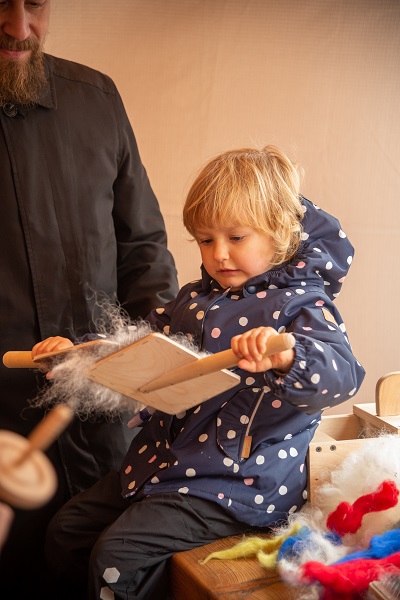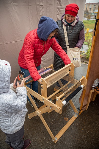 Клуб ткачества и прядения «Ткачики» провели мастер-классы, на которых можно было своими руками прочесать шерсть, скрутить нитку, соткать узор и сделать набойку листьями на ткань.