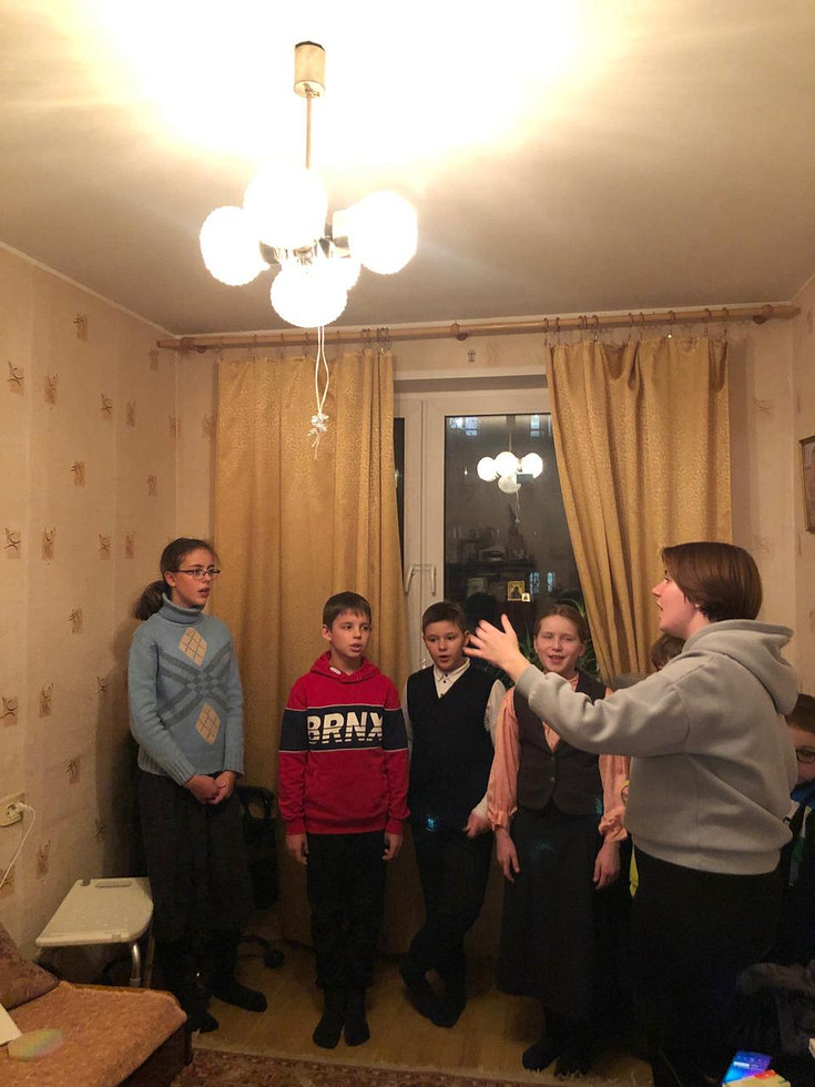 Хор воспитанников Воскресной школы под руководством Марии Вадимовны Никулиной порадовал Марию Андреевну песнопениями.Дети вручили ей подарок - комнатный цветок, за которым Мария Андреевна обещала ухаживать,также украсиливоздушными шариками комнату и кухню, что прибавило праздничного настроения.