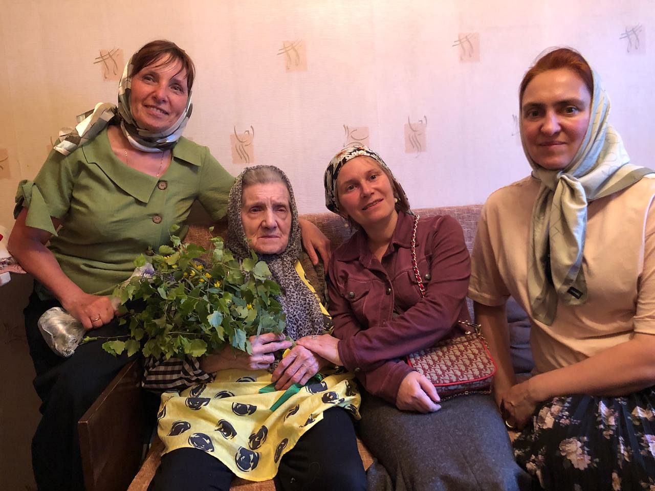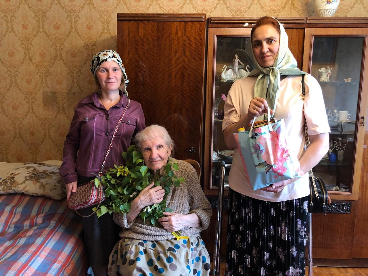 Добровольцы поздравили их с праздником, пропели тропарь Троицы и вручили продуктовые наборы, букетики березы.