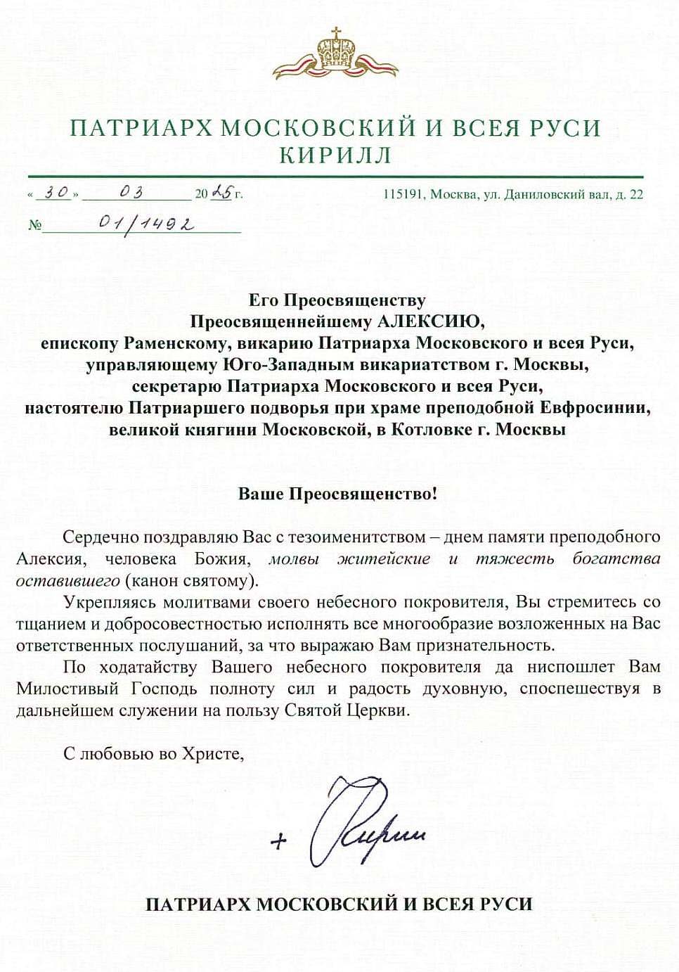 Главная/Новости/Новости Викариатства/ Поздравление Святейшего Патриарха Моcковского и всея Руси Кирилла с днем тезоименитства епископа Раменского Алексия