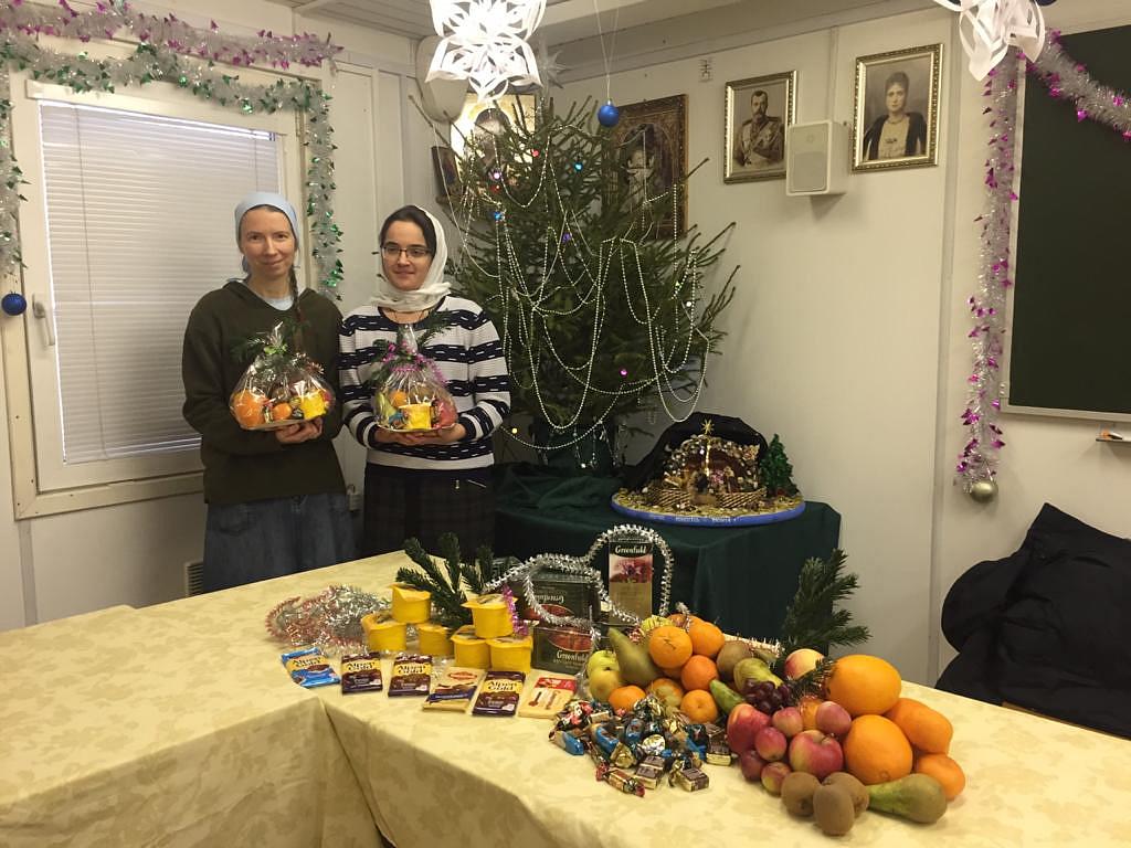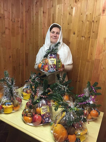 Добровольцы пропели праздничный тропарь и колядки, вручили Рождественские подарочные наборы из продуктов, сладостей и фруктов.