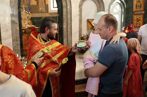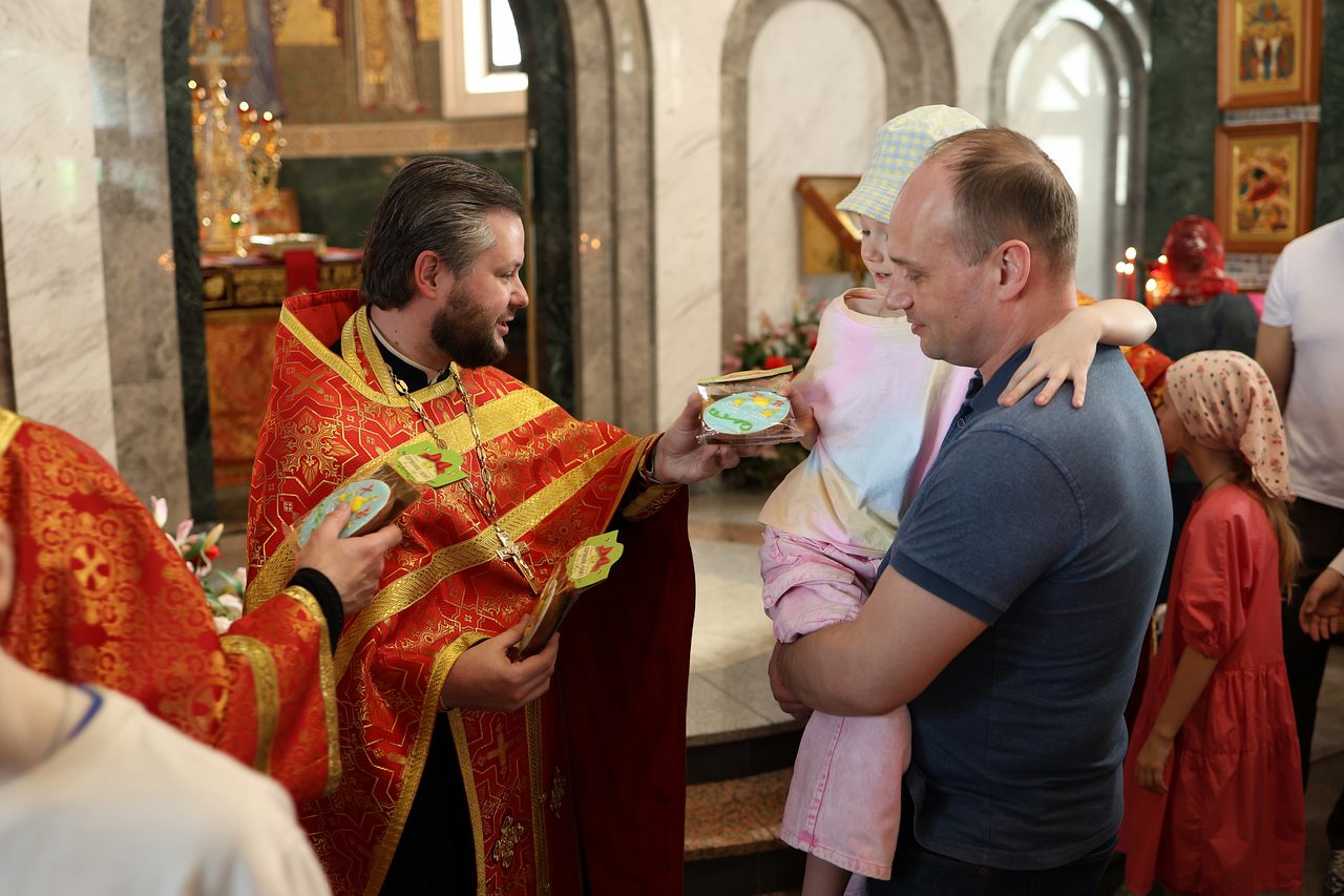 На улице были накрыты столы с угощением для всех пришедших разделить радость о Воскресшем Господе, а детям, молившимся на пасхальных Литургиях, были вручены праздничные пряники.