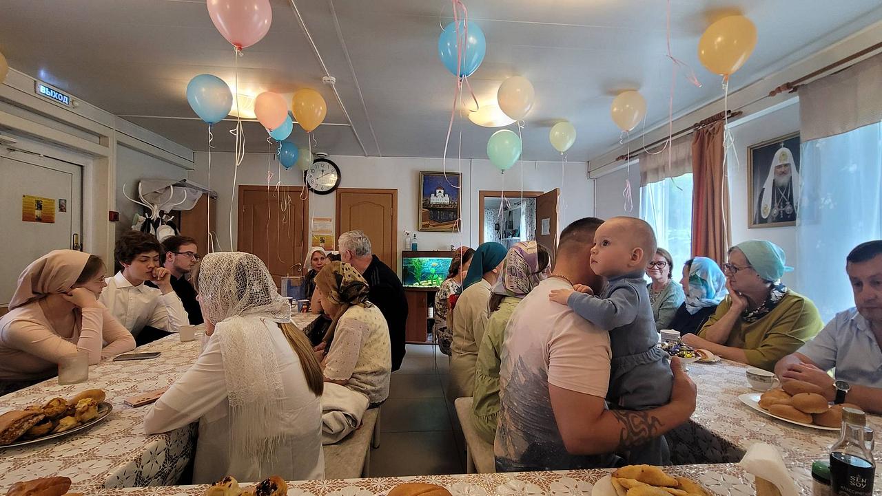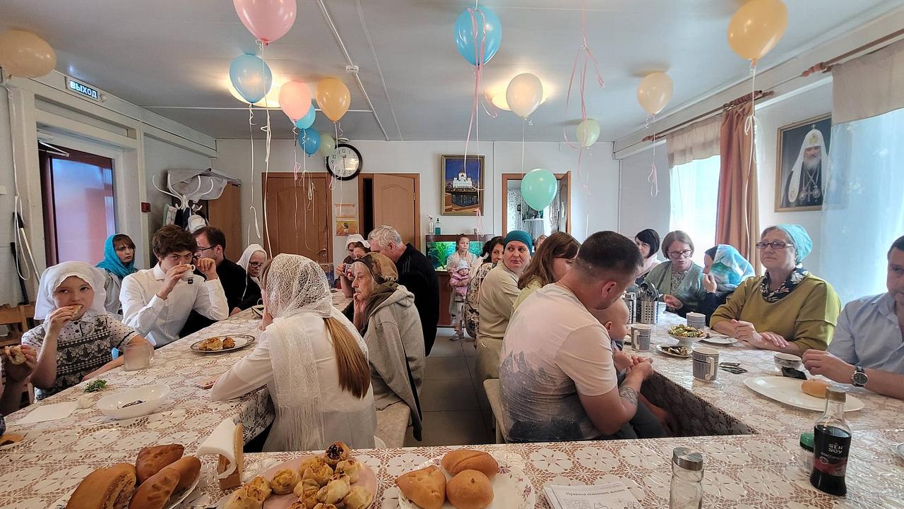 Затем в трапезной храма состоялось праздничное чаепитие с настоятелем храма. На чаепитие с прихожанами храма, молодежным активом, с многодетными семьями и парами готовящимися вступить в брак пообщался иерей Максим Глухих, рассказав о семье, верности и любви и о православном понимании этих добродетелей.