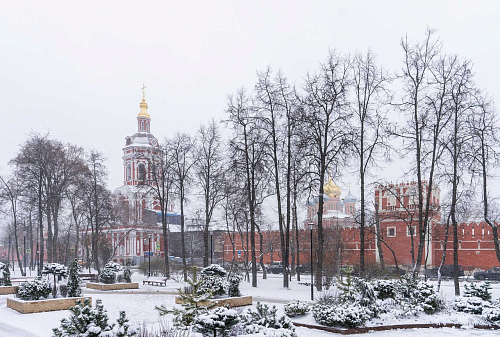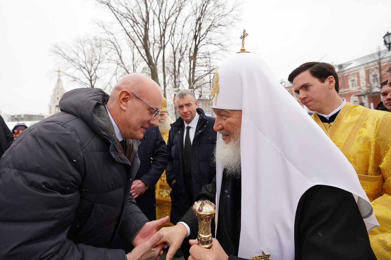 У врат Большого собора Донского монастыря Предстоятеля Русской Православной Церкви встречали: заместитель председателя Правительства Российской Федерации, сопредседатель Организационного комитета празднования 100-летия со дня блаженной кончины святителя Тихона Д.Н. Чернышенко; председатель Синодального отдела по монастырям и монашеству, наместник Донского монастыря митрополит Каширский Феогност; председатель Либерально-демократической партии России, руководитель фракции ЛДПР в Государственной Думе Федерального Собрания Российской Федерации, председатель Комитета Государственной Думы ФС РФ по международным делам Л.Э. Слуцкий; и.о. генерального директора ХПП «Софрино» В.А. Левин.