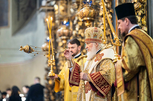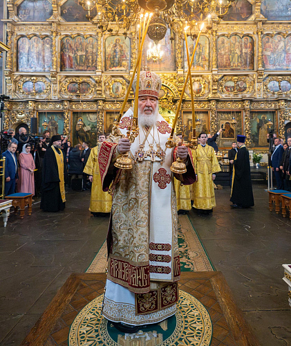 В Большом соборе Донской обители Предстоятель Русской Православной Церкви поклонился мощам святителя Тихона и совершил Божественную литургию святителя Василия Великого.