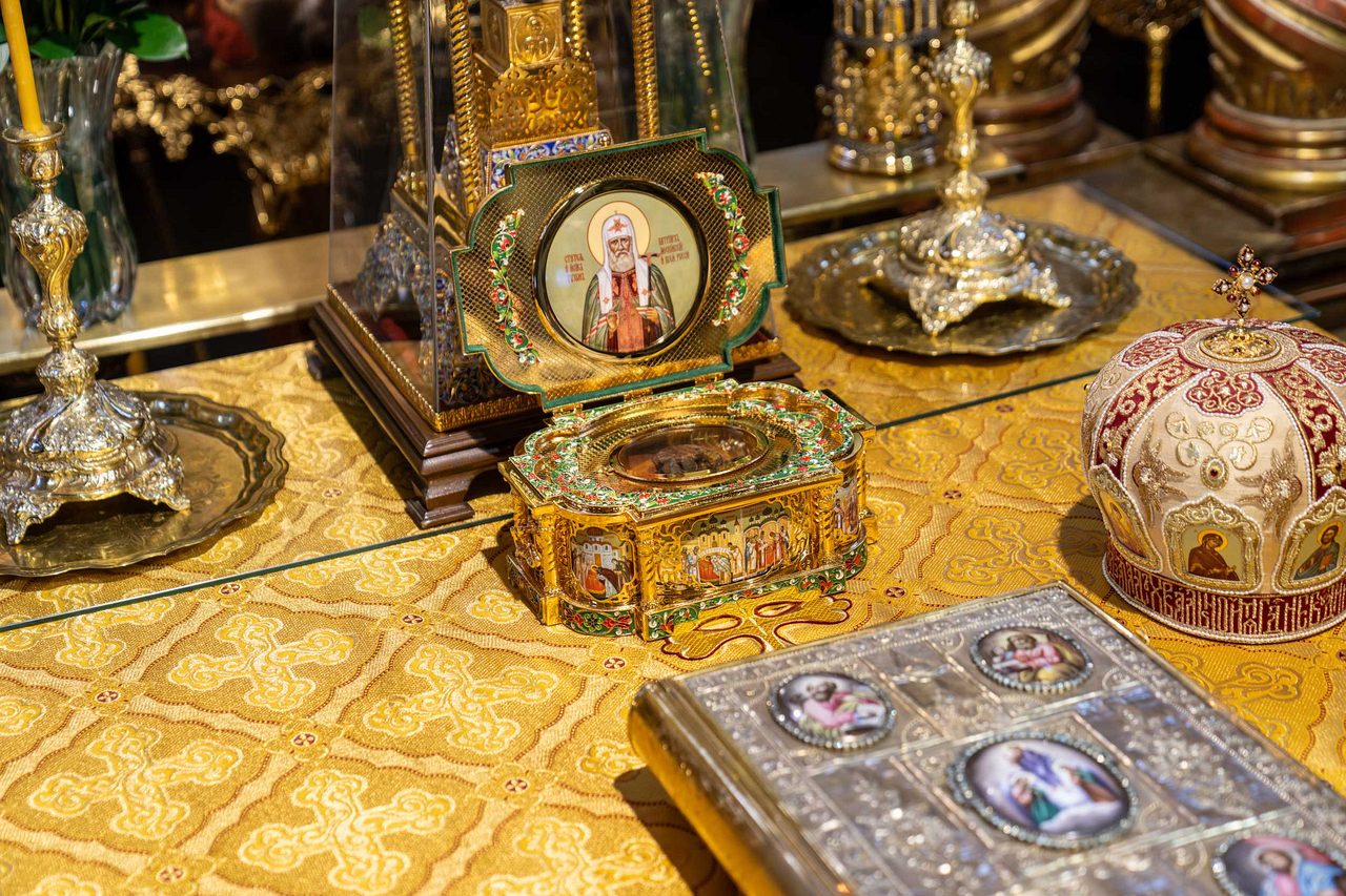 Ковчег с частицей мощей был создан мастерами Художественно-производственного предприятия «Софрино» специально для торжеств в честь 100-летия преставления святителя Тихона. Перед началом Патриаршего богослужения он был установлен на престоле Большого собора.