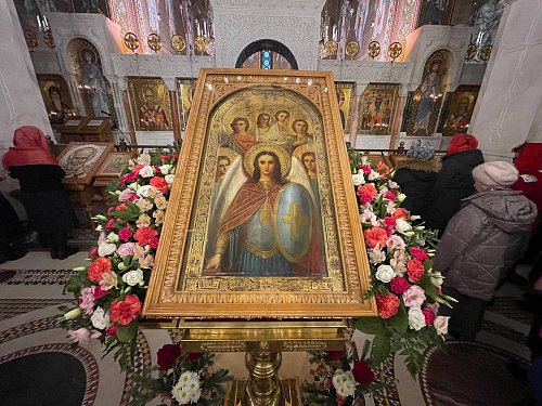 Затем настоятель храма архимандрит Мелхиседек (Артюхин) обратился к прихожанам храма и поздравил всех собравшихся с торжеством Ангельского мира, и поблагодарил всех за радость совместной молитвы в этот праздничный день.