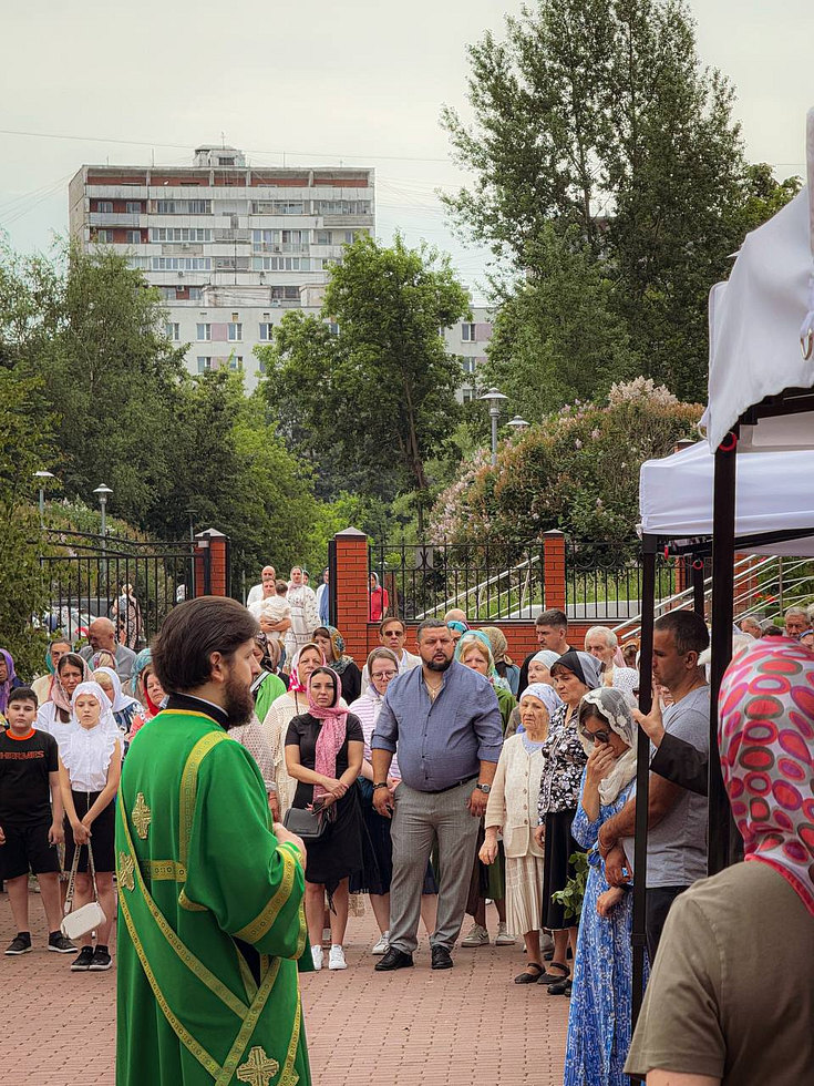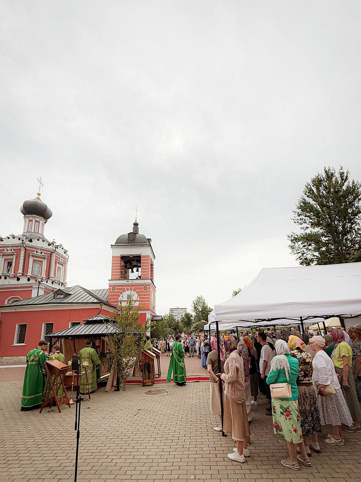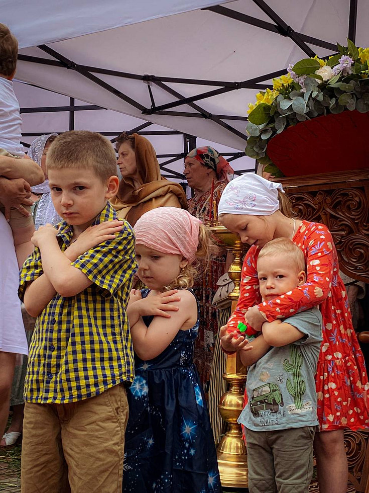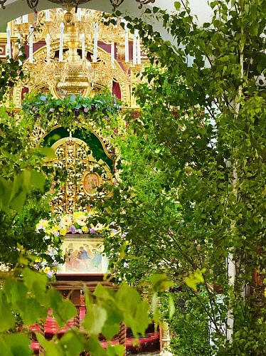 По окончании Божественной Литургии был совершен праздничный Крестный ход вокруг храма с чтением Евангелия и окроплением святой водой, затем в благоговейной обстановке была отслужена Великая вечерня с чтением коленопреклоненных молитв.