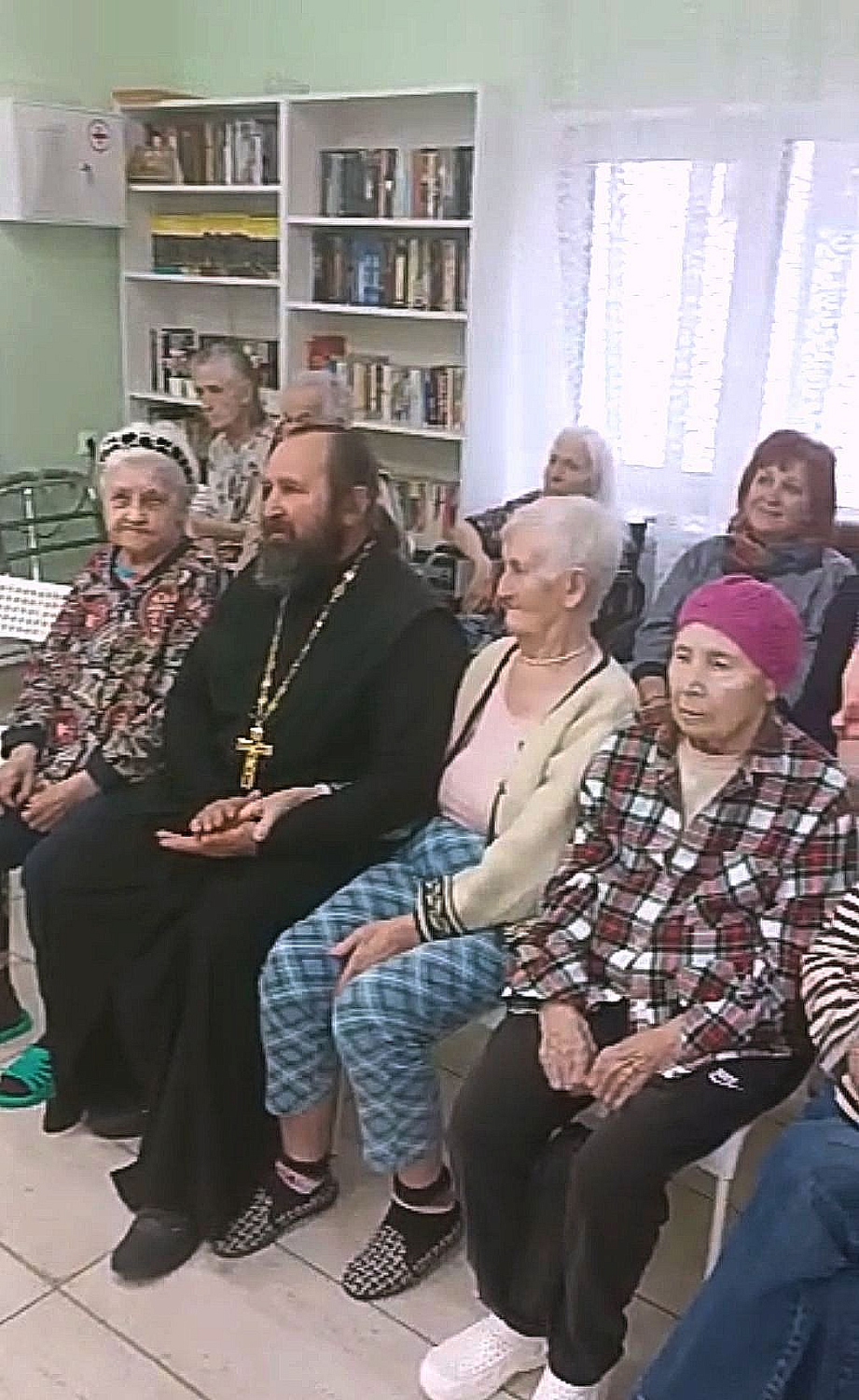 Иерей Николай обратился к подопечным пансионата с приветственным пастырским словом. Учреждению были переданы подарки.