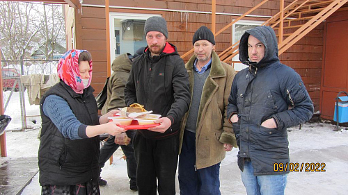 Волонтеры, представители приходского молодежного объединения храма готовят и ежедневно раздают горячие обеды для бездомных. Продукты жертвуют прихожане.