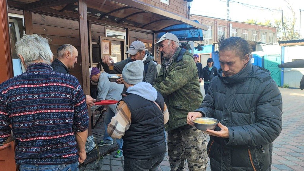 Волонтеры, представители приходского молодежного объединения храма готовят и ежедневно раздают горячие обеды для бездомных. Продукты жертвуют прихожане. В день удается накормить 15-30 человек.