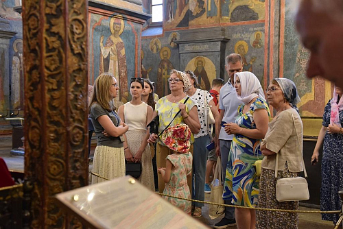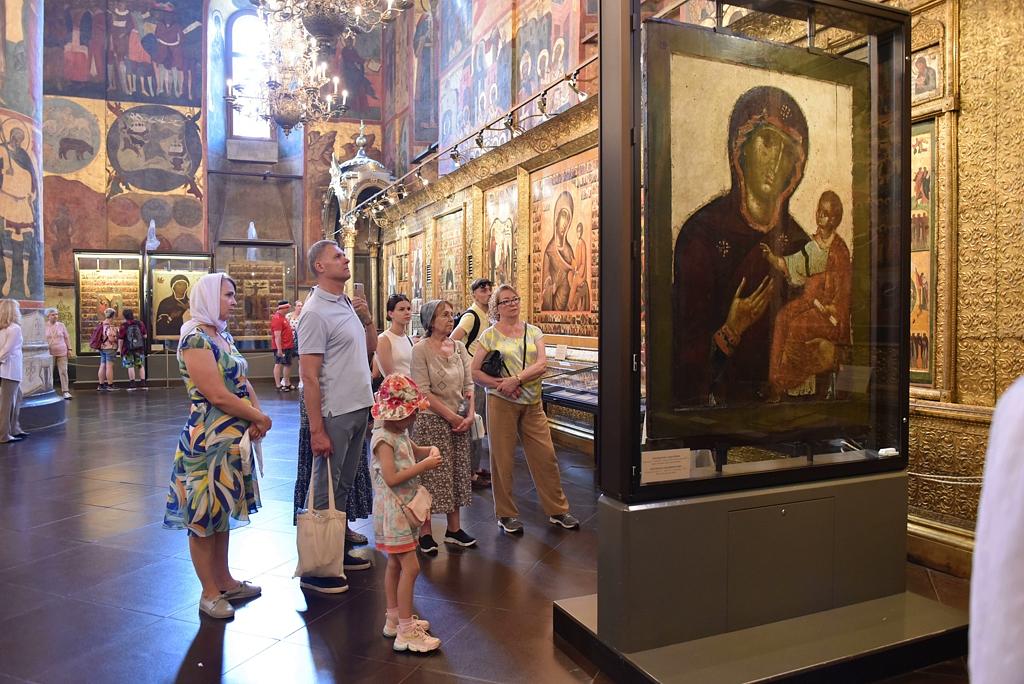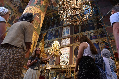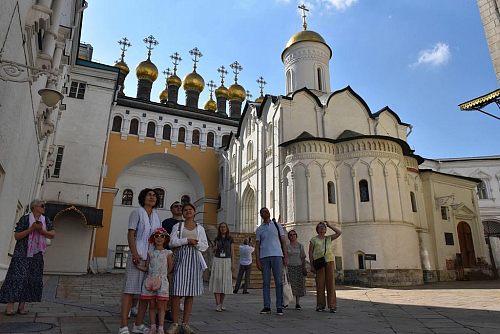 В продолжение экскурсии прихожане посетили архитектурный ансамбль Соборной площади — один из самых величественных в Европе. Каждый из расположенных здесь храмов играл свою неповторимую роль в жизни древнего Кремля. Величественный Успенский собор - место, где проходили торжественные церковные службы и совершались коронации. Архангельский собор со своей аристократической статью - усыпальница князей и царей. Уютные, стройные здания домовых церквей для уединенной молитвы царя и митрополита: Благовещенский собор и церковь Ризоположения.