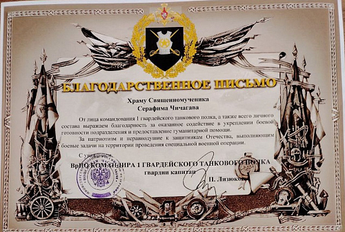 Прихожане храма собрали заготовки и парафин для окопных свечей и изготовили 130 свечей. Также были собраны теплые одеяла, кондитерские изделия, кофе, чай, средства личной гигиены, медицинские средства первой помощи и лекарства для военнослужащих. Всю гуманитарную помощь в размере 171 кг. отвезли на передовую в зону СВО, Первому Гвардейскому танковому полку. ВрИО Командира танкового полка гвардии капитан П. Лизюков передал храму сщмч. Серафима, митрополита Петроградского Благодарственное письмо за оказываемую приходом помощь, за патриотизм и неравнодушие к защитникам Отечества, выполняющим боевые задачи на территории проведения специальной военной операции.