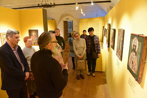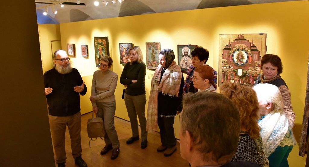 Старший научный сотрудник отдела научно-просветительной работы Музея диакон Дмитрий Николаевич Клыков познакомил паломников с редкими изводами икон Святой Троицы, Господа Иисуса Христа, Пресвятой Богородицы, необычными образами широко почитаемых и малоизвестных святых. В продолжение экспозиции гости увидели иконы, содержащие гимнографические и дидактические сюжеты, иллюстрации евангельских притч и событий библейской истории, иконы редких сюжетов и произведения, отличающиеся неожиданными вариантами традиционных изображений или уникальными и непривычными деталями их композиций.