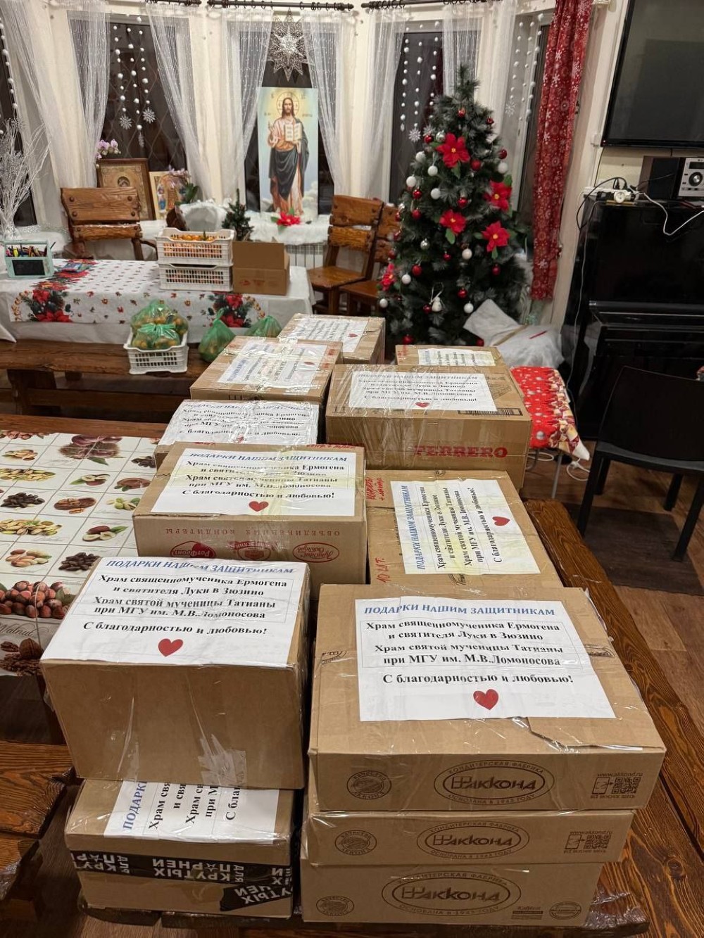 24 декабря 2025 года прихожане храма Священномученика Ермогена, Патриарха Московского и всея Руси, чудотворца в Зюзине совместно с прихожанами храма святой мученицы Татианы при МГУ им. М.В.Ломоносова в преддверии Нового года и Рождества Христова подготовили и упаковали 544 подарка (конфеты, мандарины, мед) на фронт.