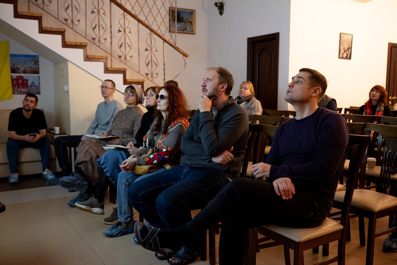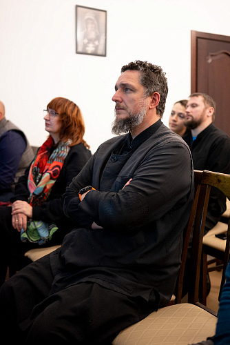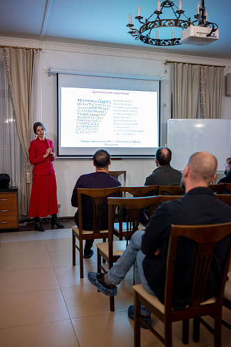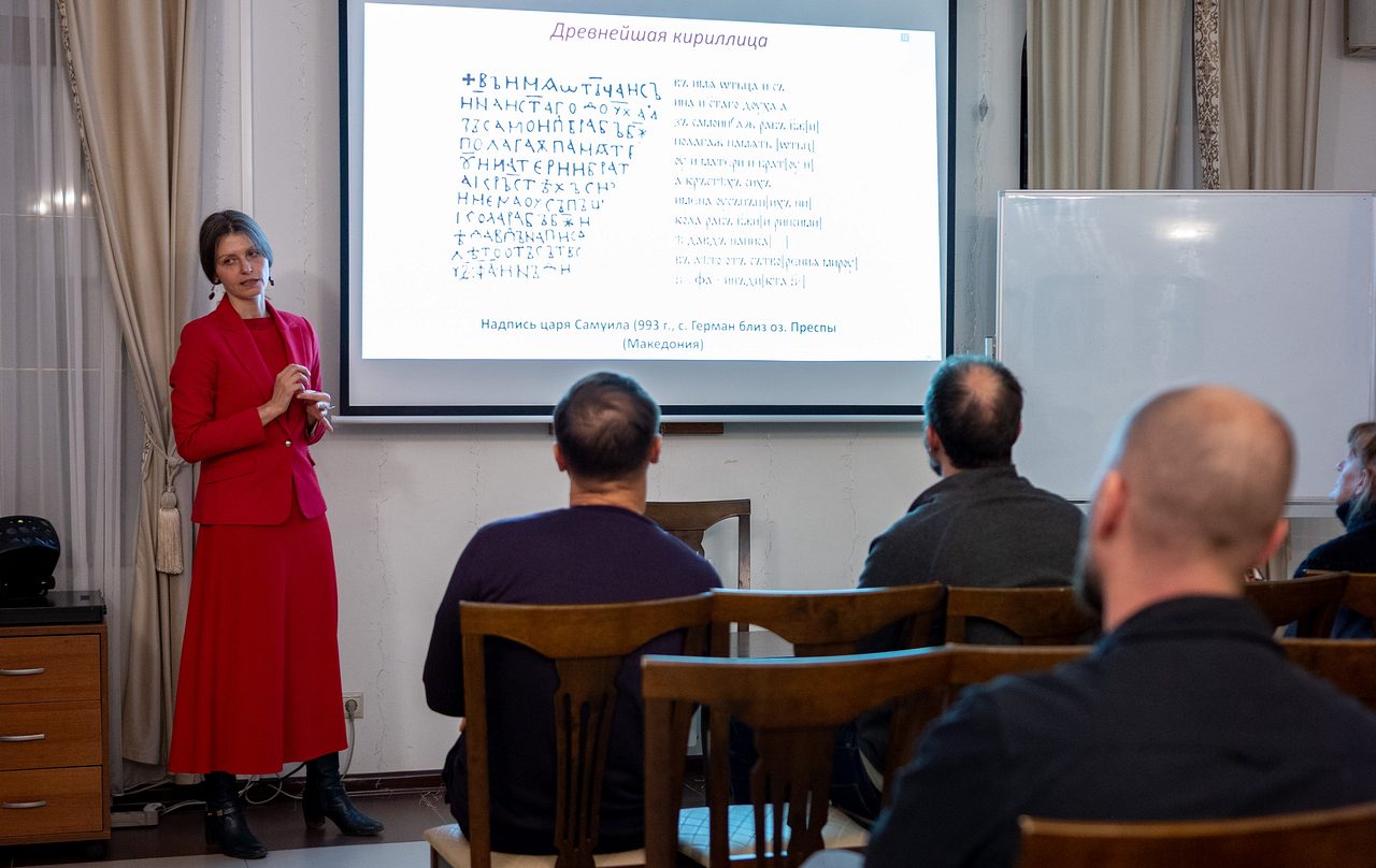 В кратком вступительном слове Александра Евгеньевна напомнила о просветительских трудах святых равноапостольных братьев Кирилла и Мефодия, о появлении двух славянских азбук – глаголицы и кириллицы. В ходе беседы преподаватель МДА сочетала приёмы лекционной подачи информации с практическим разбором текста. Как и на предыдущем занятии, слушатели вновь погрузились в древнюю эпоху: по очереди читали и общими усилиями переводили отрывки из памятников письменности, размышляли о заложенных в них смыслах. По-настоящему интересным и полезным стало знакомство с сохранившимся в многочисленных рукописях повествованием «О унынии».