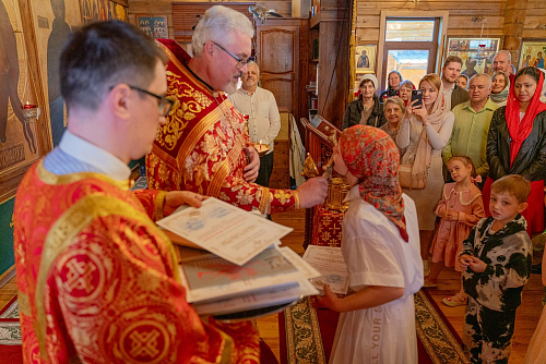 После окончания Божественной Литургии выпускников торжественно и тепло поздравил настоятель храма протоиерей Роман Марков. Ребятам были вручены Свидетельства об окончании детской Воскресной школы и книга «Закон Божий».
