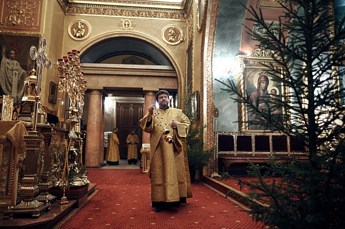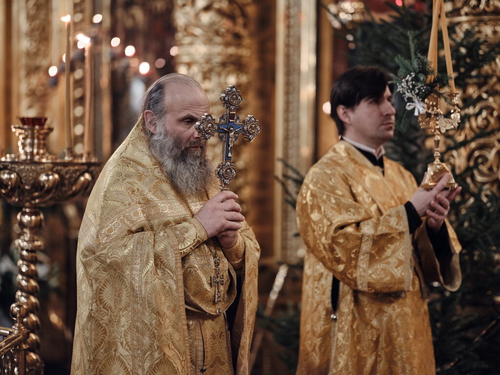 В Рождественскую ночь Его Преосвященству сослужили клирики собора.