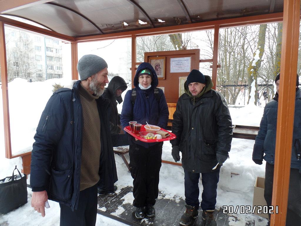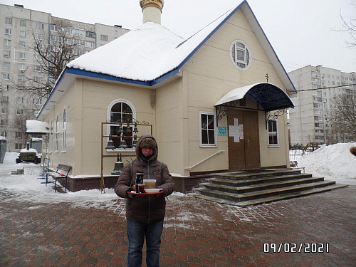 Также по благословению настоятеля, оказывается помощь бездомным людям, нуждающимся в горячей еде. Волонтеры храма ежедневно раздают горячие обеды для бездомных. В день удается накормить 10-15 человек. Еда раздается за территорией храма в одноразовой посуде с соблюдением всех санитарных норм и дезинфекции.