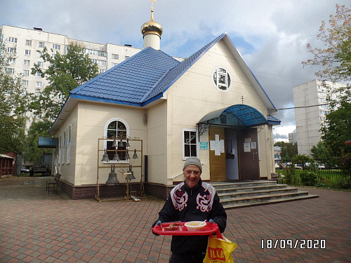 Также по благословению настоятеля, оказывается помощь бездомным людям, нуждающимся в горячей еде. Волонтеры храма ежедневно раздают горячие обеды для бездомных. В день удается накормить 10-18 человек. Еда раздается за территорией храма в одноразовой посуде с соблюдением всех санитарных норм и дезинфекции.