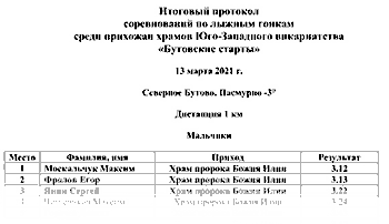 На дистанции 3 км первое место среди юношей и мужчин занял Головкин Максим от прихода храма Владимирской иконы Божией Матери в Южном Бутово, среди девушек и женщин первое место заняла Нефедова Вероника, вторые места заняли Юрчиков Иван и Чистова Мария, а третье место - Гордеев Александр и Кожевникова Софья, все так же от прихода храма святого пророка Божия Илии в Сев. Бутово.