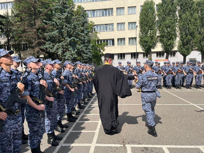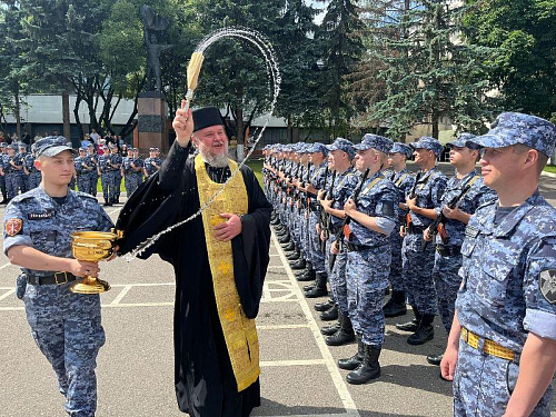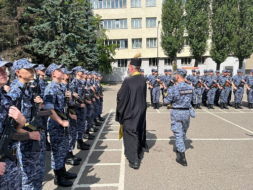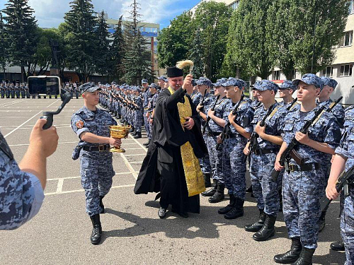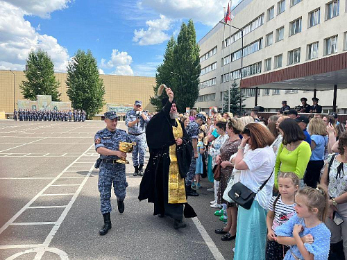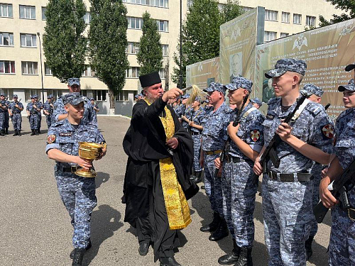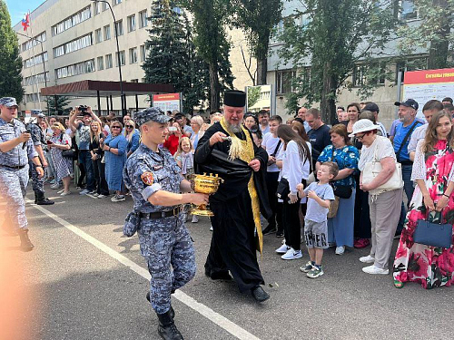 В этот торжественный день радость события разделил с воинами настоятель храма игумен Дамиан (Залетов). Он обратился к военнослужащим со словом поздравления и ободрения, а также окропил воинов и родителей Святой водой.