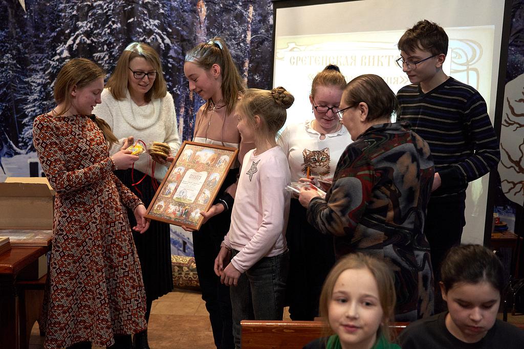 Всем командам были вручены почетные грамоты, памятные подарки и пряничные медали, специально приготовленные к викторине. Грамоты получили и отдельные ребята – наиболее активные участники викторины. В конце игры состоялось чаепитие с теплыми свежевыпеченными блинами.