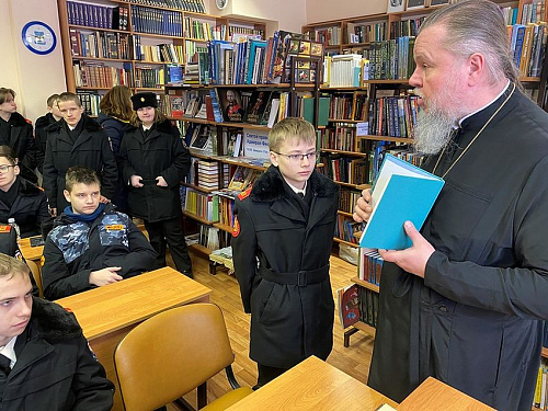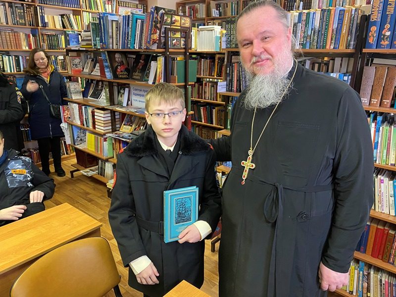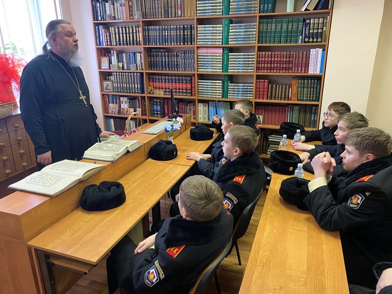 15 марта 2024 года в библиотеке дома причта храма святого праведного воина Феодора Ушакова в Южном Бутове настоятель игумен Дамиан (Залетов) провел специальное занятие о книгопечатании и книге для кадетов-юнармейцев.