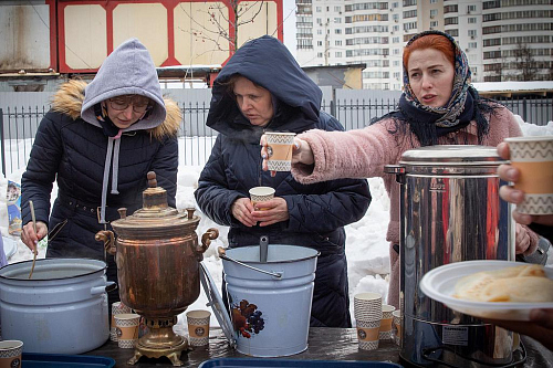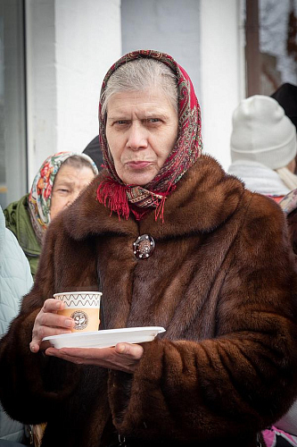 По доброй традиции после Божественной Литургии всех прихожан храма на улице ждали свежеиспеченные блины со сладостями и горячий ароматный чай.