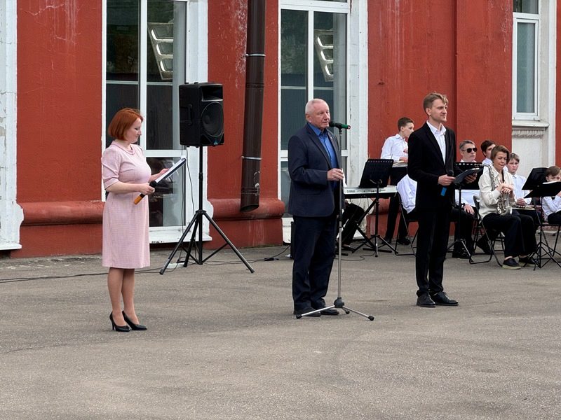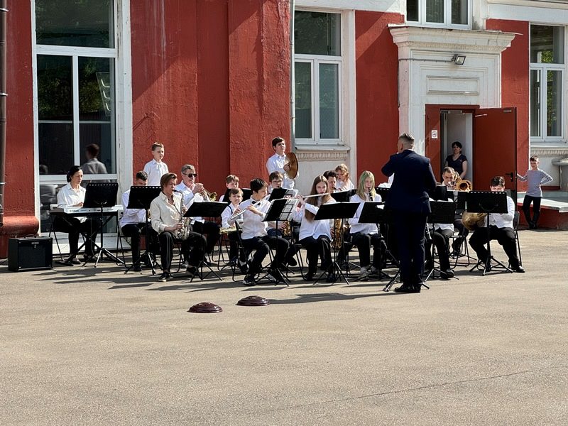 После официальной части знаменная группа колледжа Академии водного транспорта вынесла знамена. Играл духовной оркестр Дворца творчества детей и молодежи.