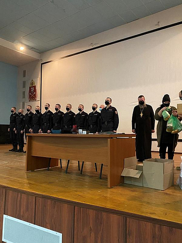 Настоятель храма святого праведного воина Феодора Ушакова в Южном Бутове игумен Дамиан (Залетов) выступил перед воинами и поздравил их с праздниками Рождества Христова и Нового года. Особое внимание настоятель обратил на личность непобедимого адмирала Ф.Ф, Ушакова, который прославился человеколюбием и мужеством. Игумен Дамиан напомнил, что первая военная награда Святого адмирала была ему вручена за мужество и мудрость в защите своих воинов во время эпидемии.