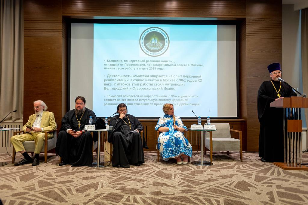 В тот же день в 13.00 состоялась секция, подготовленная Епархиальной комиссией по церковной реабилитации, на тему «История и современность: научно-практический опыт Московской епархии по церковной реабилитации лиц, отпавших от Православия». Модератором выступил протоиерей Роман Марков.