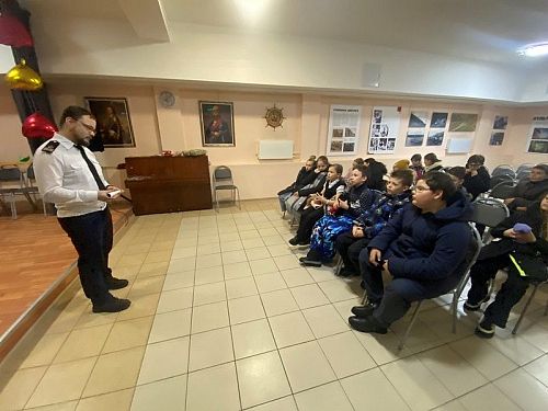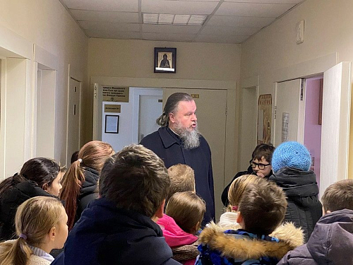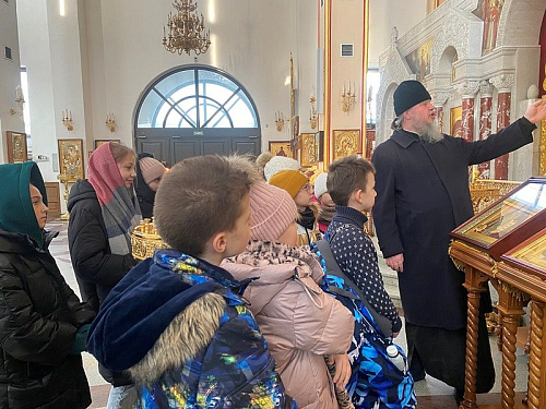 Внутри храма игумен Дамиан рассказал школьникам о тех событиях жизни Небесного покровителя храма - святого адмирала Феодора Ушакова и других Святых, которые стали примерами добродетели, преданности, смелости и скромности.