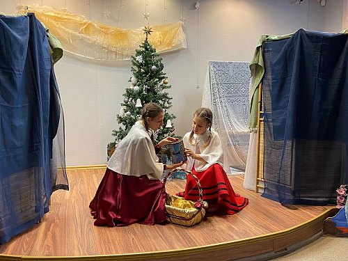 Учащиеся подготовили спектакль "Рождественское путешествие", сценарий которого традиционно пишется для детей певчей храма и ответственной за молодёжное служение Марией Шуваловой. Сказочные истории каждый год разные, и они настолько интересные, что дети просят родителей читать их перед сном. В этот раз герои спектакля преодолевали препятствия, путешествуя сквозь времена года с волшебной шкатулкой. В спектакле дети исполняли роли пастухов и волхвов.