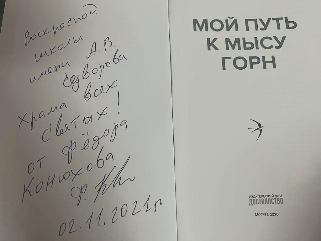 Учащиеся Воскресной школы храма посетили часовню, возведеннуюпротоиереем Федором Конюховым в честь Александра Васильевича Суворова.В память о прошедших праздничных мероприятиях протоиерей Федор Конюхов передал в библиотеку Воскресной школы храма свою монографию «Мой путь к мысу Горн» с дарственной надписью.